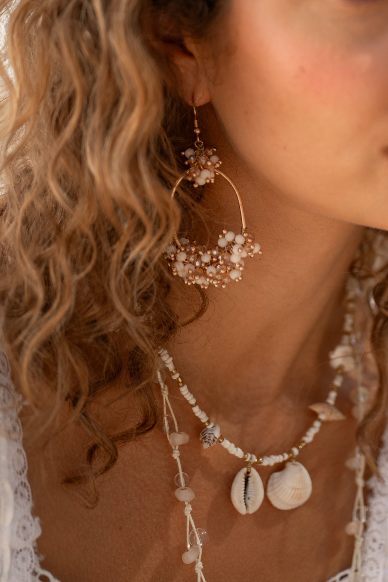 Het ontwerp bestaat uit een fijne goudkleurige basis met handgeregen kralen die samen een speels volume vormen. De mix van matte en licht glanzende accenten geeft diepte zonder zwaar te ogen. Deze bohemian oorbellen cream voelen licht aan en bewegen soepel mee, waardoor ze comfortabel blijven om te dragen.