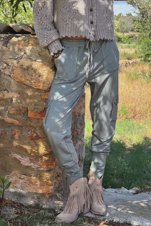 Product gegevens: Comfy cargo broek, zakken, elastische band met aantrek koord, model valt smaller aan de onderkant