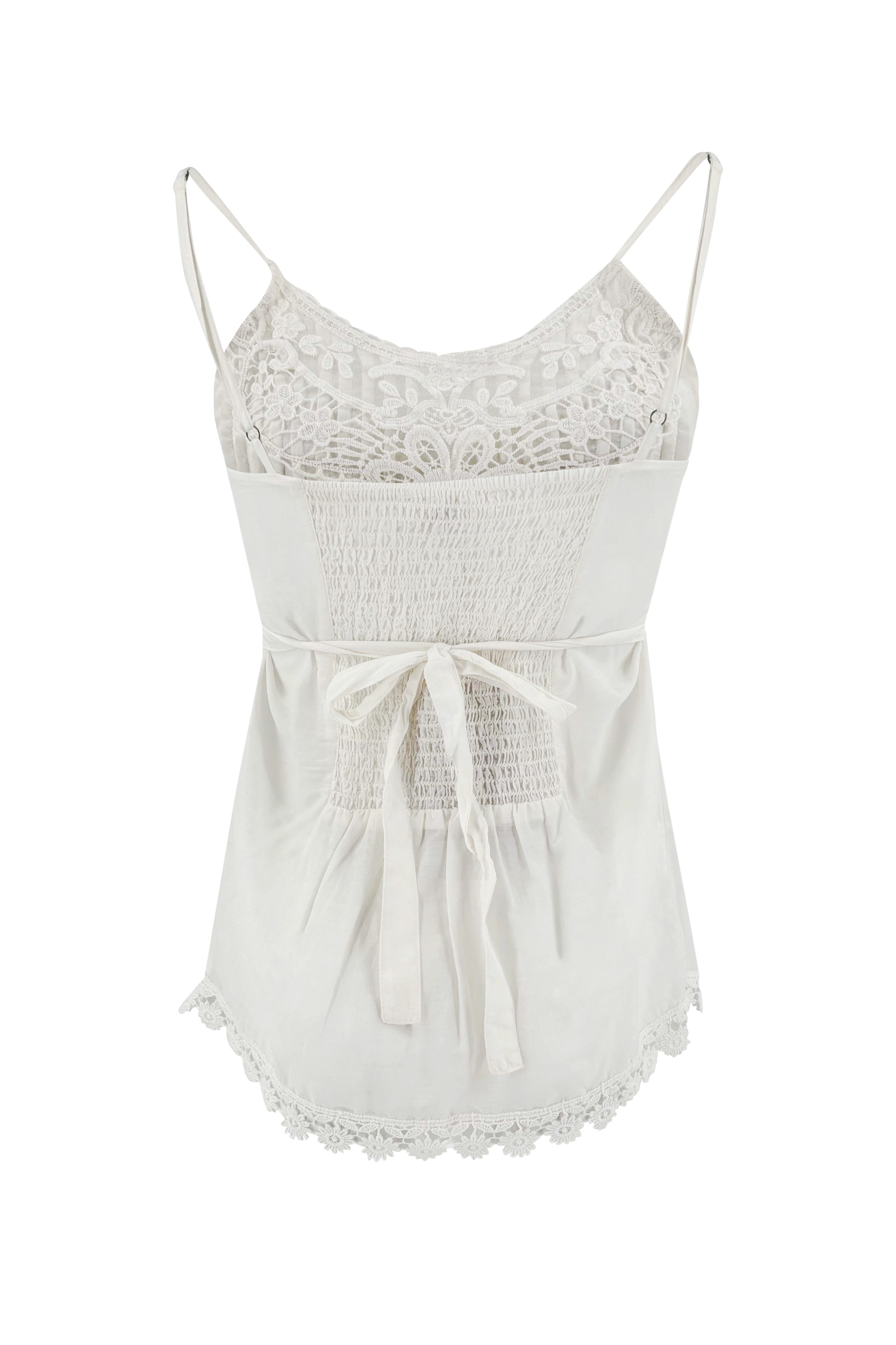 De fit van Strap Top Vida Cream is relaxed en vrouwelijk. De top volgt je lichaam zonder strak aan te voelen. Dunne bandjes leggen het accent op je schouders en halslijn. Er zijn kanten details en subtiel structuurwerk toegevoegd. Zo oogt de top romantisch en luxe, maar nog steeds draagbaar voor elke dag.
