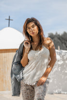 Vervolgens is Strap Top Vida Cream ideaal voor laagjeslooks. Draag hem onder de knit met ingebreide hartjes. Of style de top met een gilet en een boho jeans. Daarmee ontstaat meteen de typische mix van romantische kleding en stoer denim. Precies zoals Romantic Soul bedoeld is. Contrast maakt de look!