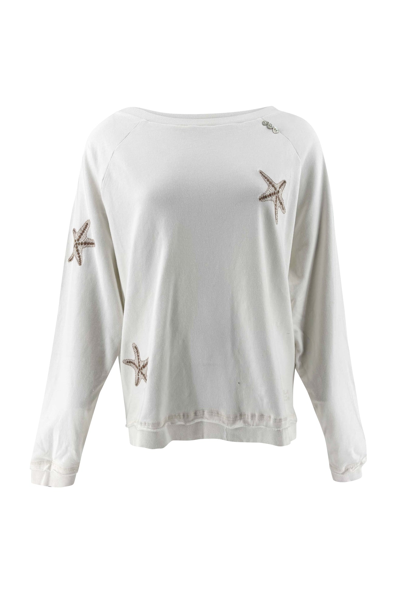 De Baggy Sweater Posa Cream van Isla Ibiza Bonita is een zachte cream sweater dames met een subtiele beach uitstraling. De lichte crèmekleur vormt een rustige basis binnen de Coastal Dream collectie en wordt versterkt door de verfijnde zeesterrenborduursels.