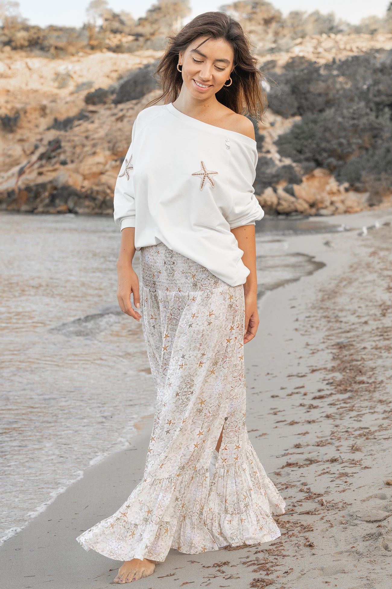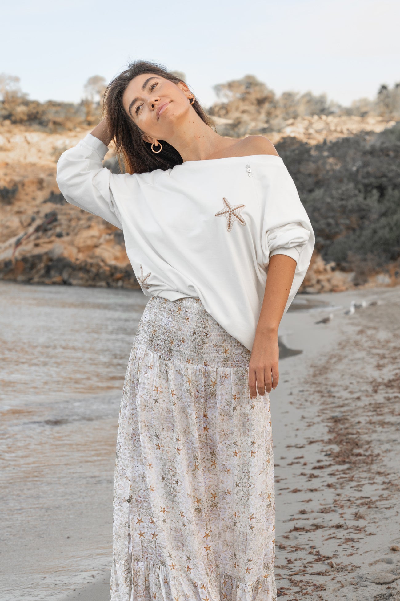 De geborduurde zeesterren zorgen voor een zachte verwijzing naar zee en strand, zonder dat het ontwerp druk wordt. Daardoor blijft deze cream sweater dames makkelijk te combineren met zowel effen basics als prints. Draag haar met een joggingbroek in khaki voor een complete strand outfit dames, of combineer met een luchtige rok voor een meer vrouwelijke bohemian kleding uitstraling.