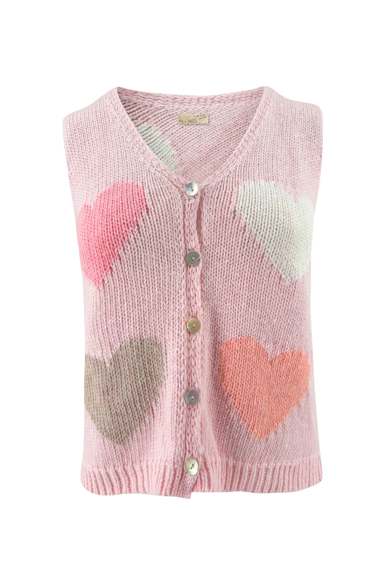 De Gilet Heart Zonas Light Pink van Isla Ibiza Bonita is een gebreide gilet dames met een speelse en romantische uitstraling. De zachte lichtroze tint gecombineerd met de ingeweven hartvormen geeft dit item direct een zonnige, vrouwelijke Ibiza vibe.