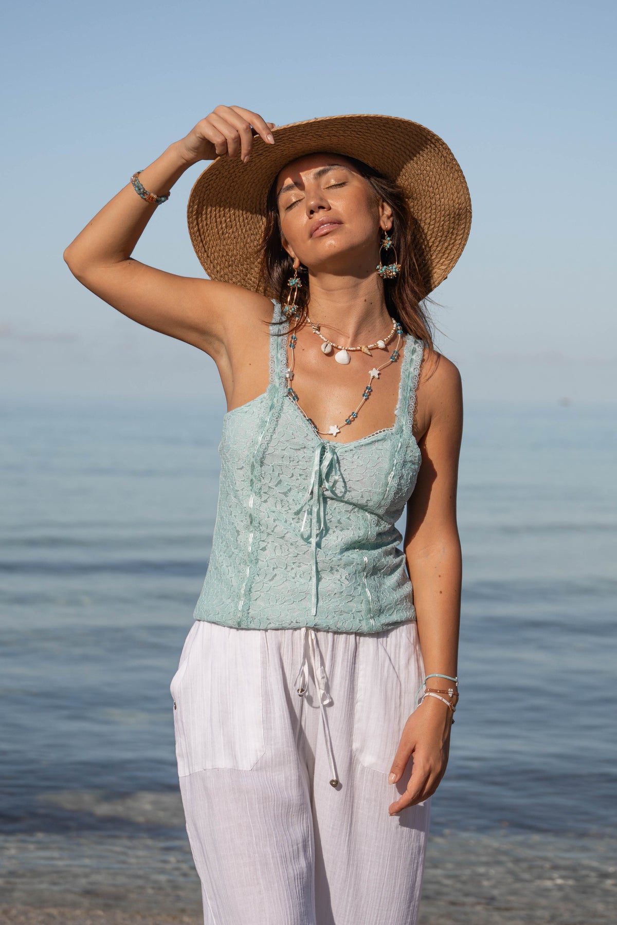 De Lace Singlet Plata Turquoise is een turquoise kanten singlet dames die vrouwelijkheid, kleur en Ibiza flair samenbrengt in één zomers ontwerp. Een veelzijdige essential binnen de collectie van Isla Ibiza Bonita die je moeiteloos combineert in elke bohemian garderobe.