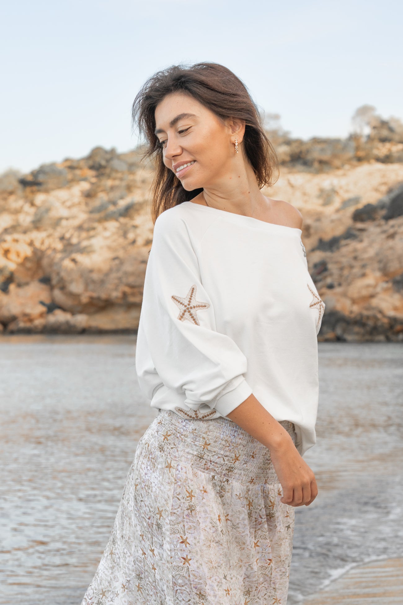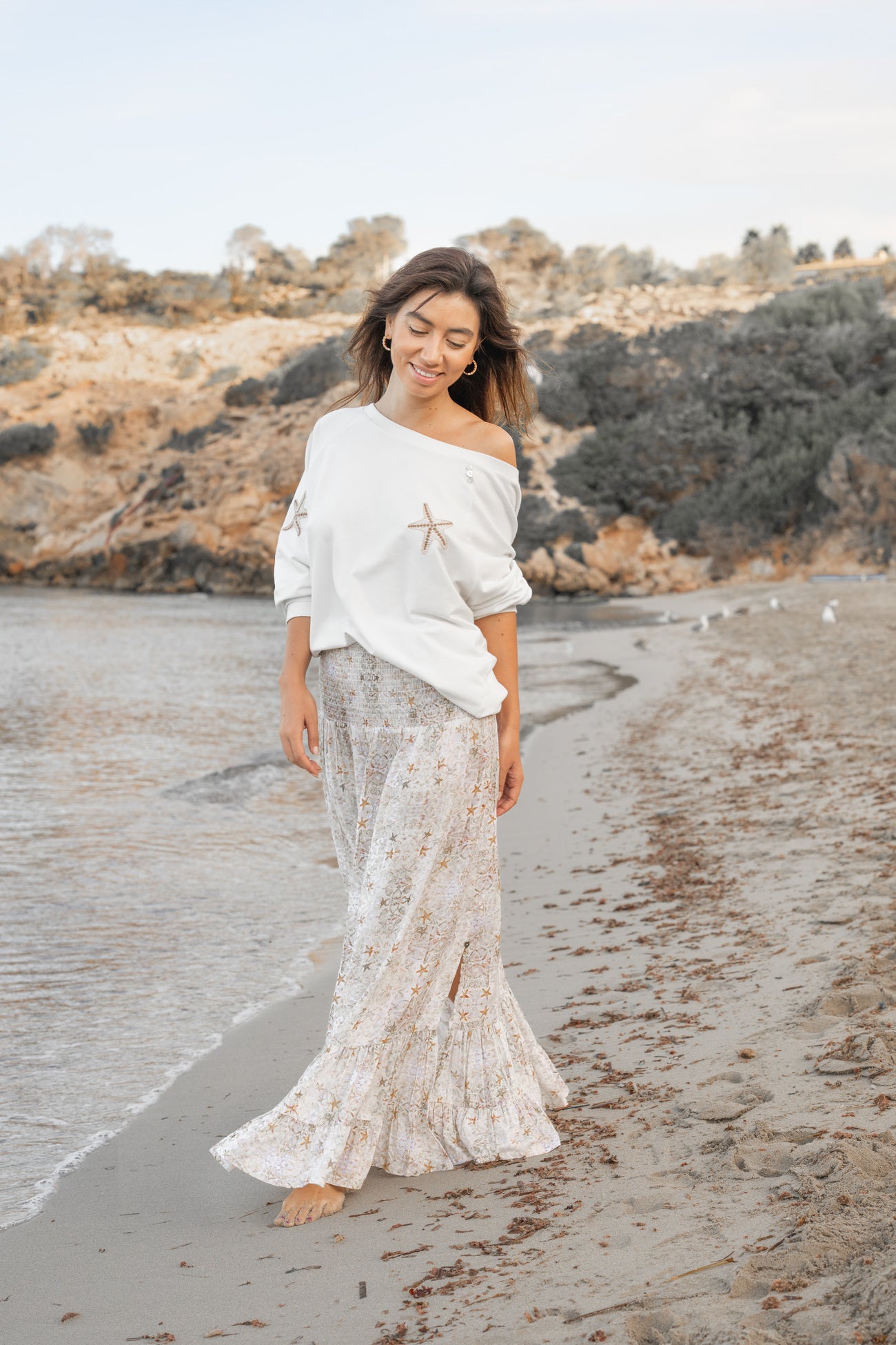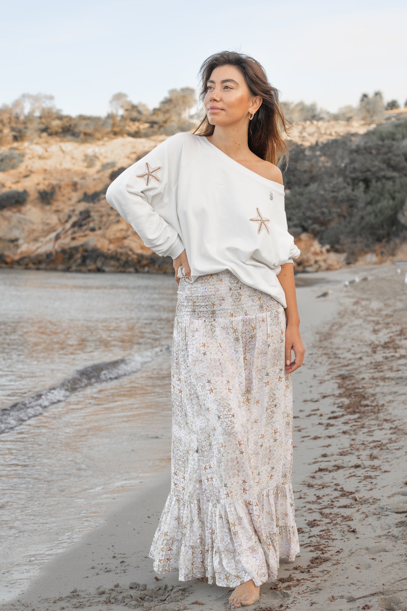 De Long Skirt Tierra van Isla Ibiza Bonita is een luchtige lange strandrok dames met een verfijnde zeesterrenprint. De zachte zandtinten en subtiele stranddetails geven deze rok een ontspannen, vrouwelijke uitstraling die perfect past binnen de Coastal Dream collectie.