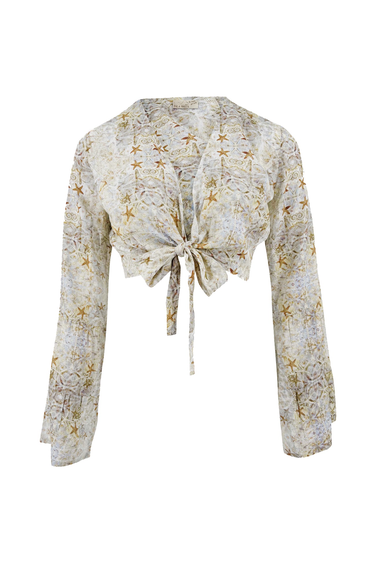 De Short Blouse Tierra van Isla Ibiza Bonita is een luchtige zeesterren blouse dames met een zachte en zomerse uitstraling. De subtiele strandprint met kleine zeesterren geeft dit model direct een ontspannen Ibiza vibe, perfect passend binnen de Coastal Dream collectie.