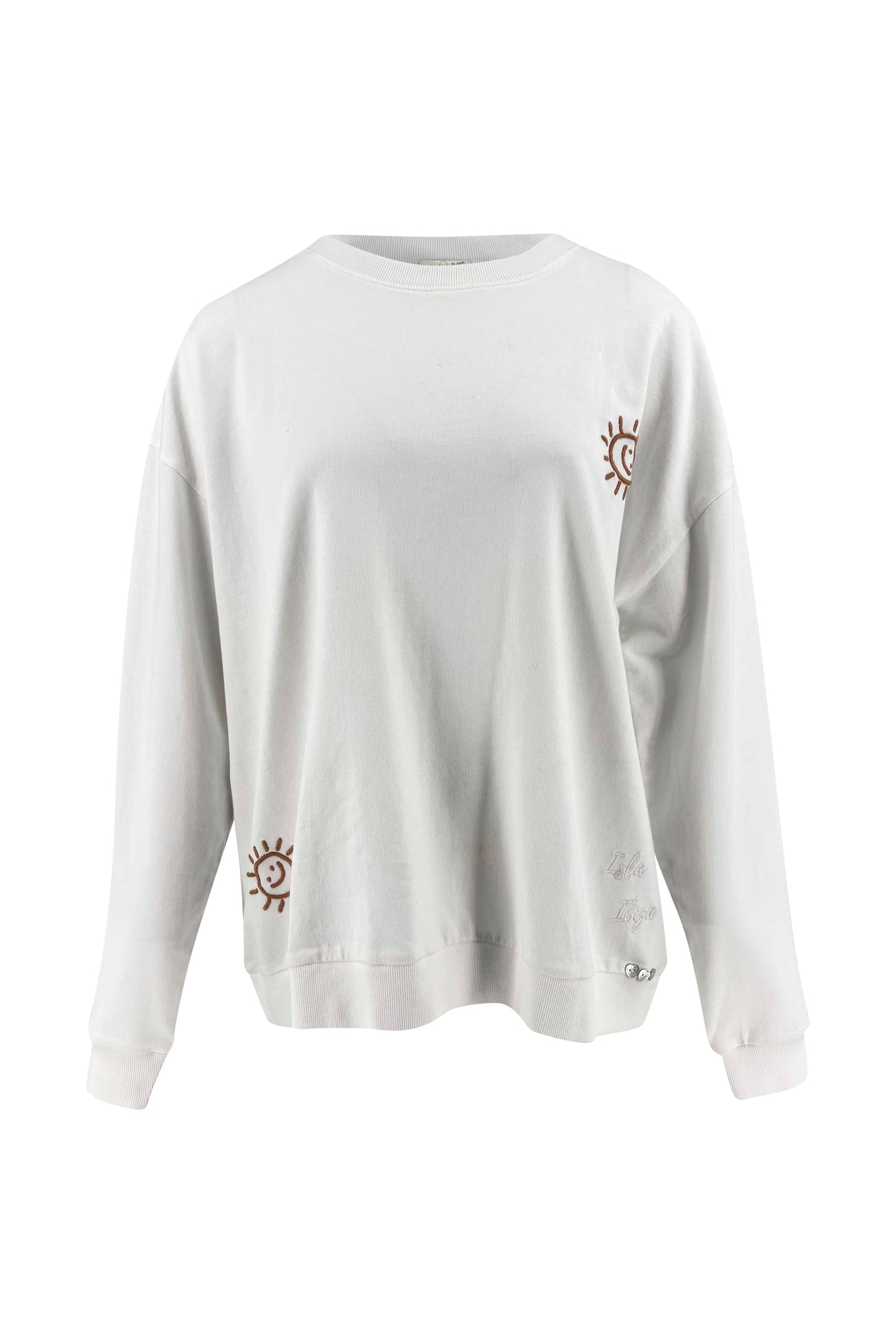 Deze cream sweater dames heeft een baggy pasvorm die soepel om het lichaam valt. De ronde hals en brede boorden zorgen voor een casual silhouet dat perfect aansluit bij een ontspannen Ibiza stijl. De subtiele borduursels met zonmotief geven het ontwerp een speelse en zomerse touch zonder overheersend te zijn.