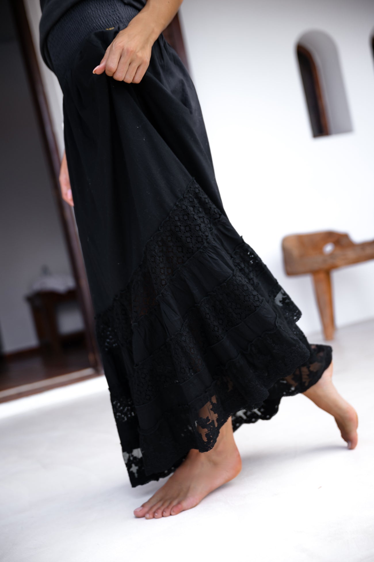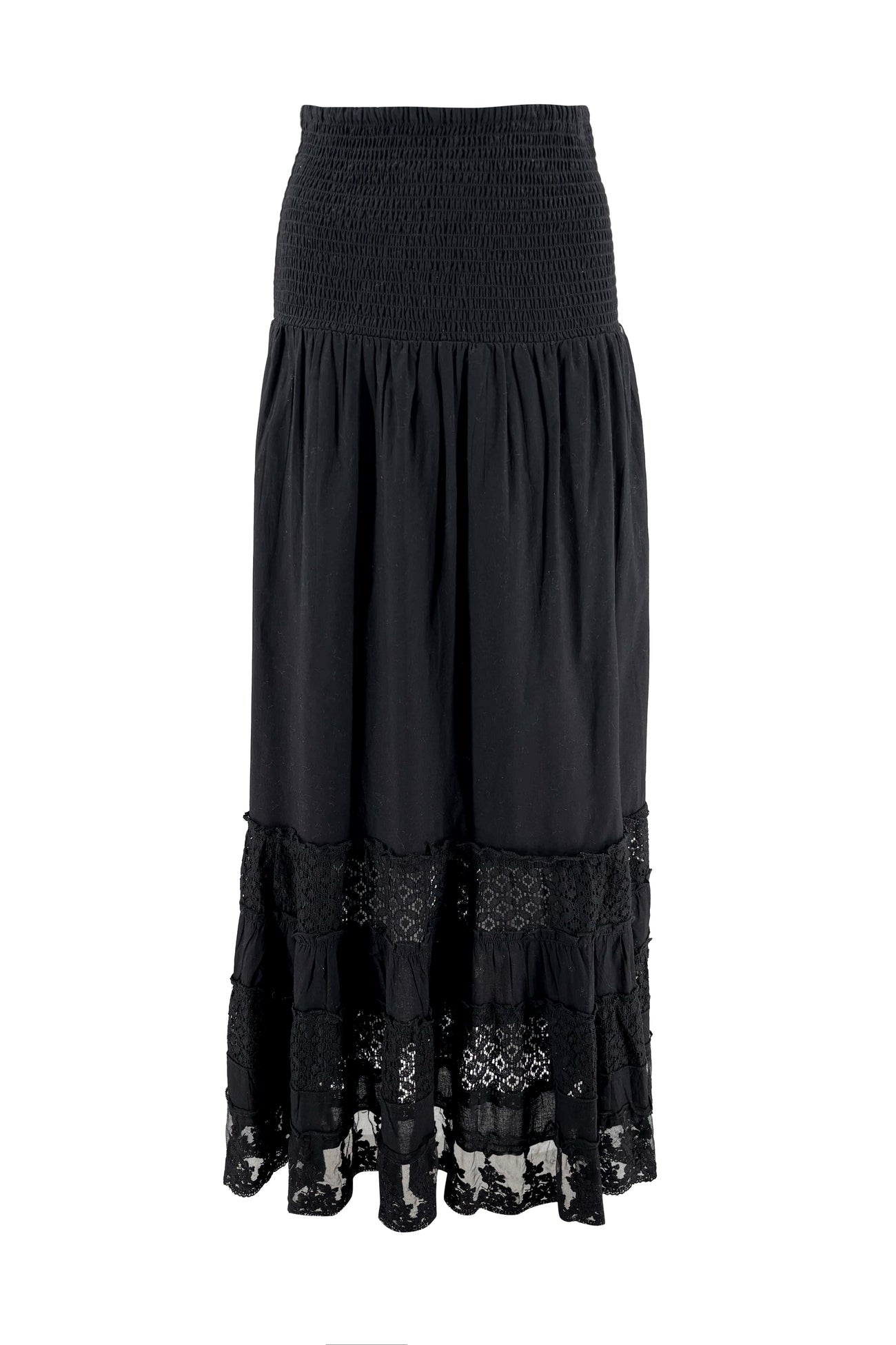 Deze lange zwarte rok heeft een comfortabele, gesmokte tailleband die mooi aansluit en zorgt voor een flatterend silhouet. Vanuit de taille valt de rok losjes naar beneden, waardoor er een luchtige beweging ontstaat bij iedere stap. Onderaan is de rok afgewerkt met meerdere lagen kant, wat diepte en textuur toevoegt aan het ontwerp.