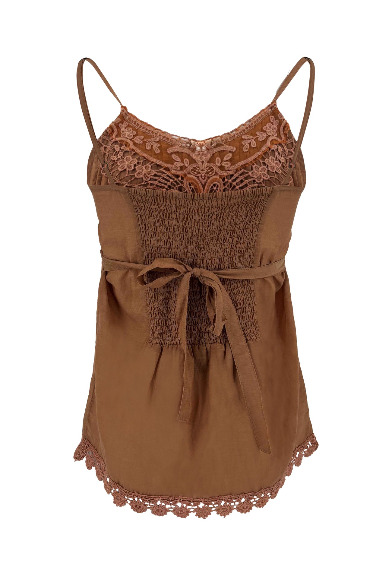 De top heeft smalle bandjes en een gesmokte bovenkant die mooi aansluit op het lichaam. Hierdoor ontstaat een flatterende pasvorm die comfortabel aanvoelt en tegelijkertijd vrouwelijk oogt. Het sierlijke kantwerk op het decolleté trekt subtiel de aandacht en geeft deze bohemian top terra een bijzondere, handgemaakte uitstraling.