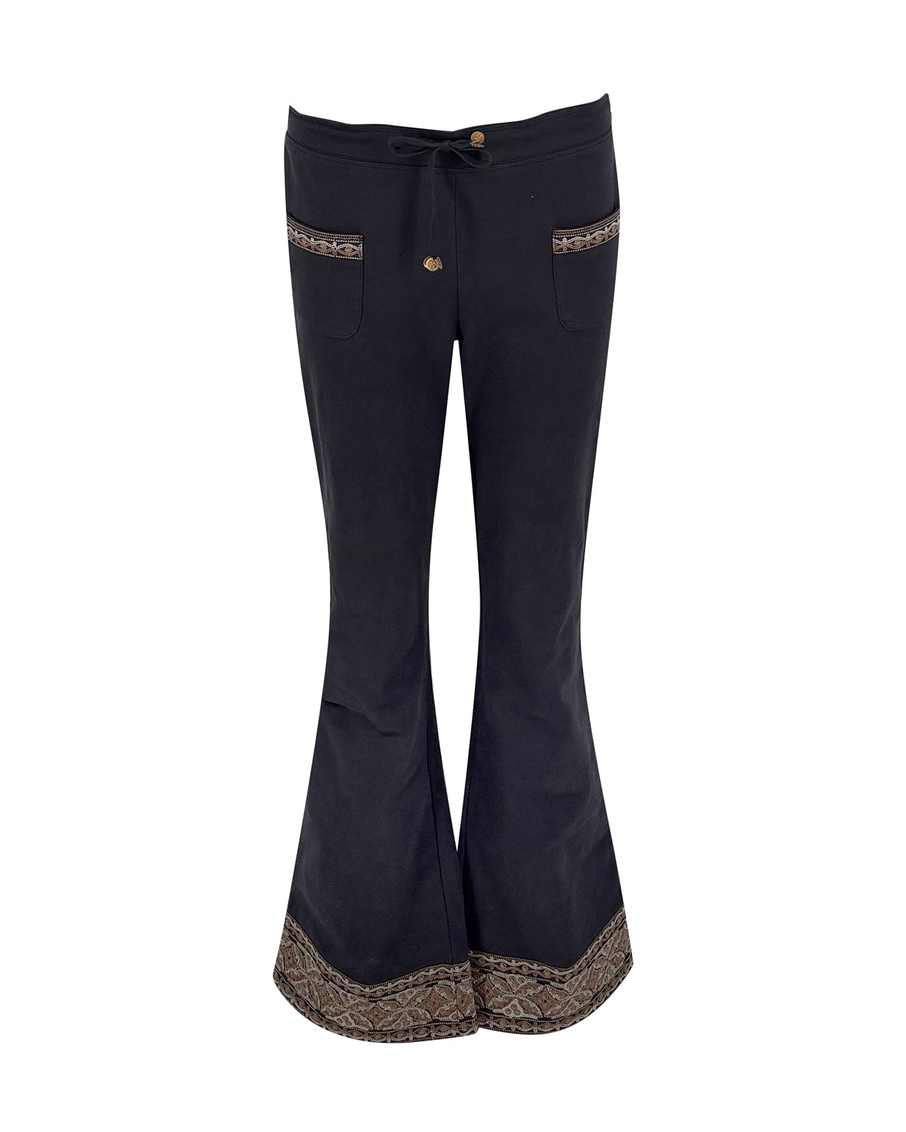 Product gegevens: Flared broek gemaakt van stevige tricot stof, met koord in de tailleband en rijkelijk versierd