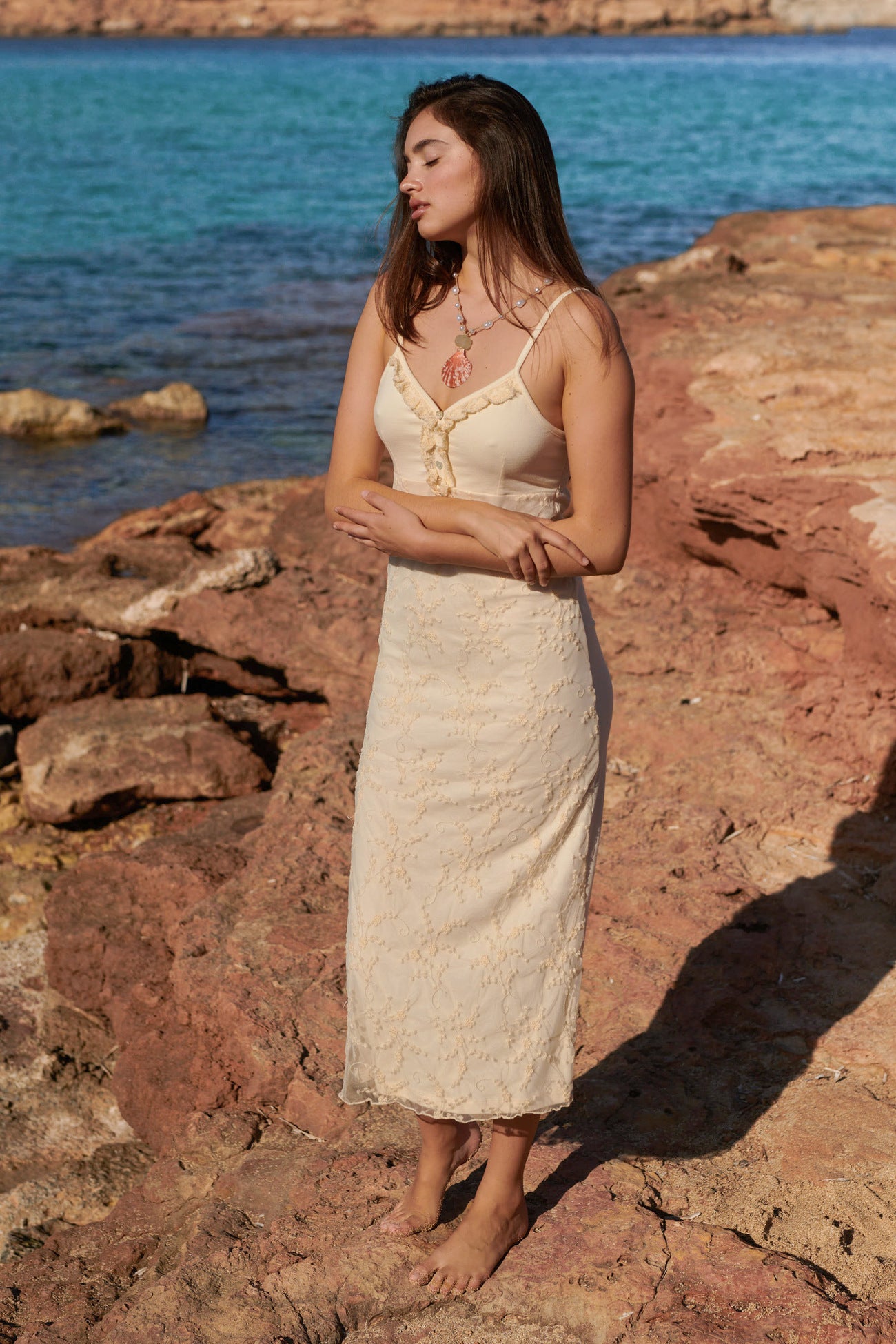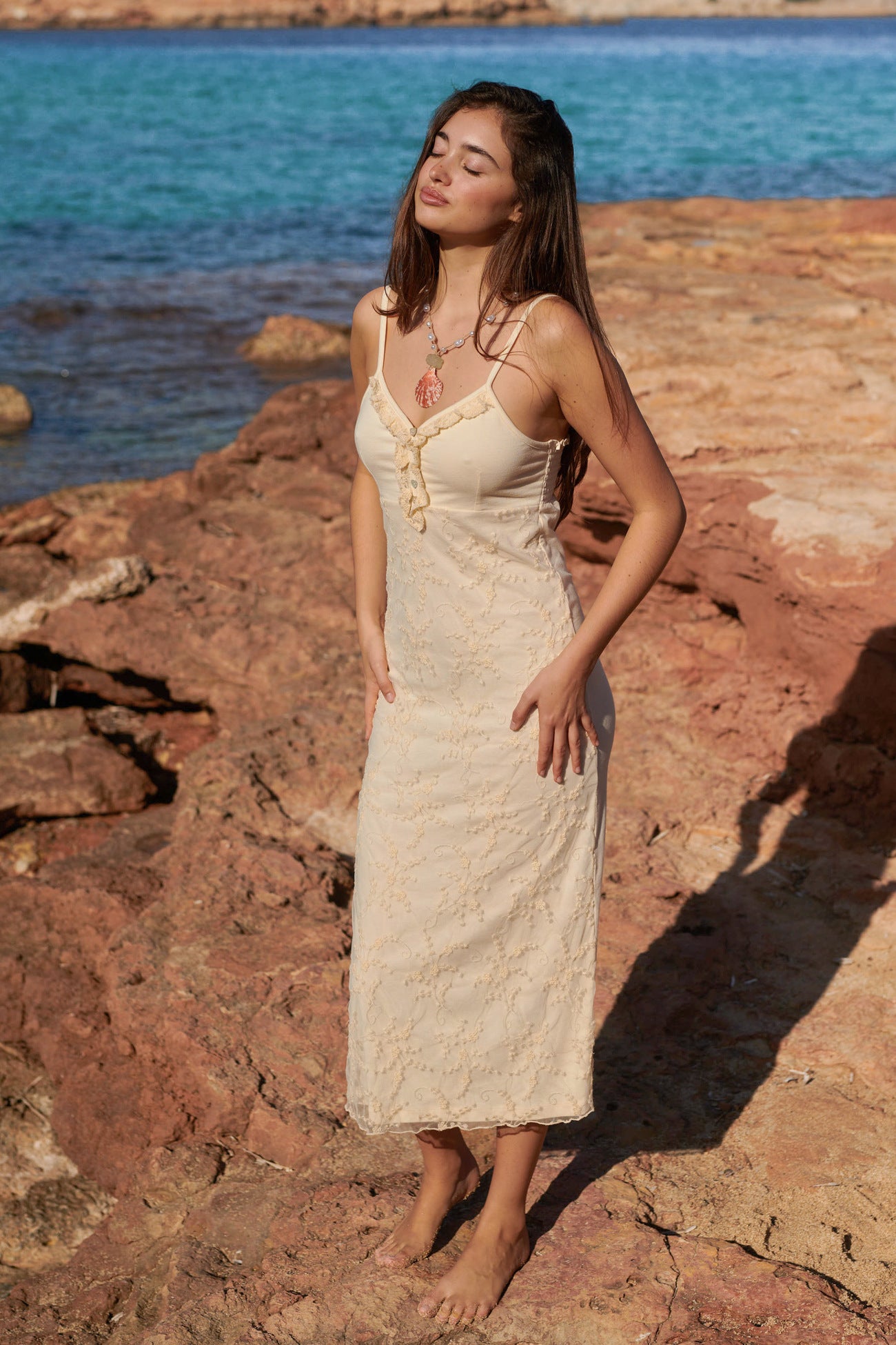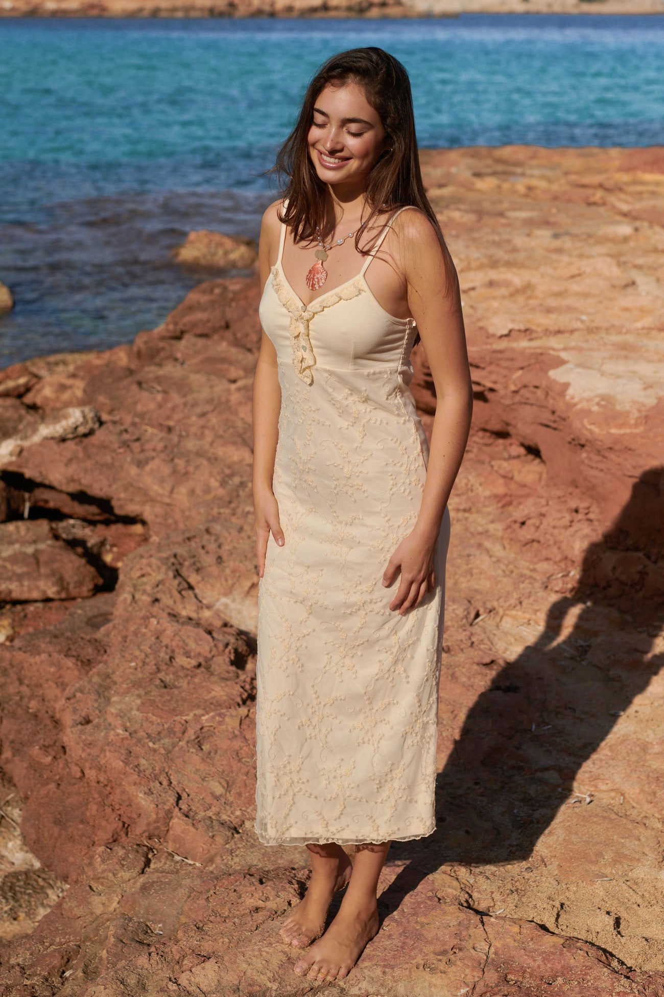 Deze Embroidered Sleeveless Dress Free Spirit Cream van Isla Ibiza in het cream ademt Ibiza vibes. Lange jurk met dunne schouderbandjes, kanten details, rok bestaat uit twee langen stof waarvan de bo Bestel snel en geniet van de bohemian lifestyle, elke dag opnieuw.
