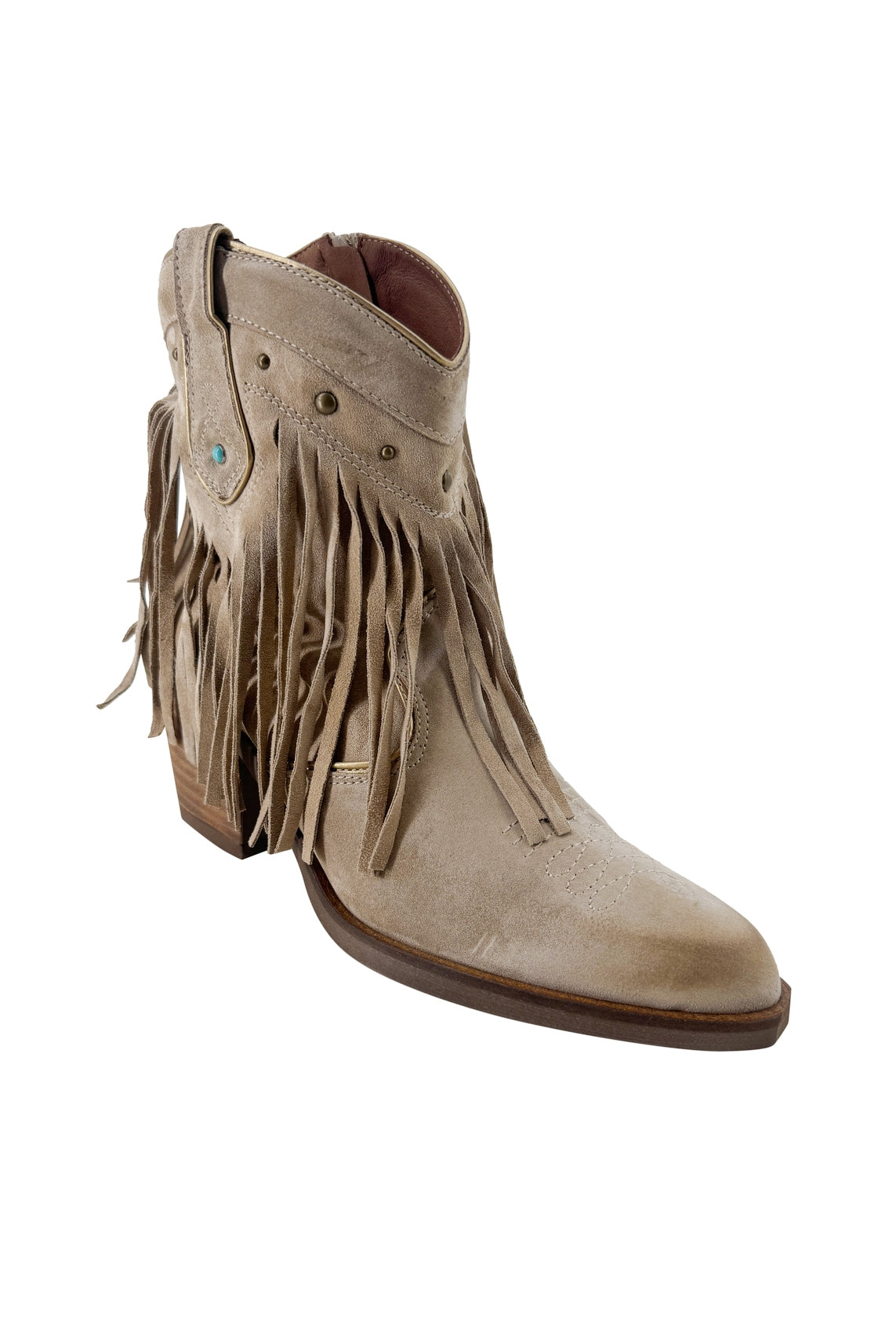 Product gegevens: Mooie western laars met franjes, valt over de enkel, met ritssluiting, hakhoogte 7 centimeter, de laarzen zijn van suede met kunststof zool en zijn gemaakt in Spanje