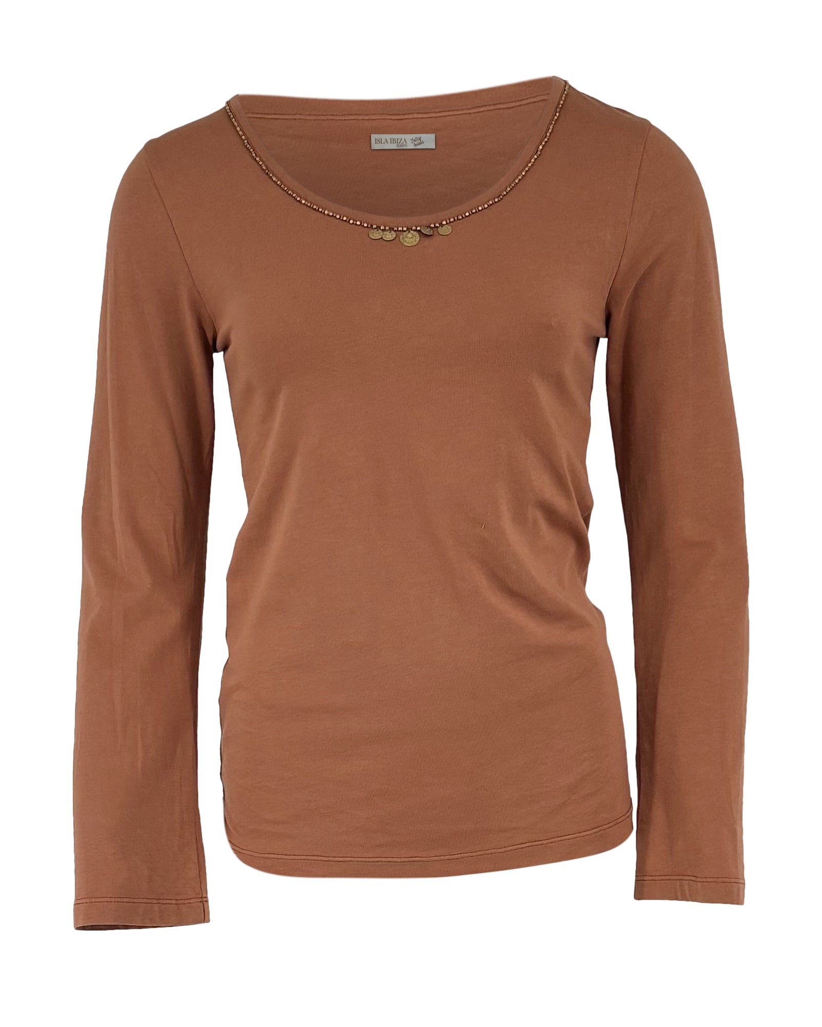 Product gegevens: Heeft een ronde hals, bezet met sierrand en muntjes, gemaakt van een zachte stretch stof