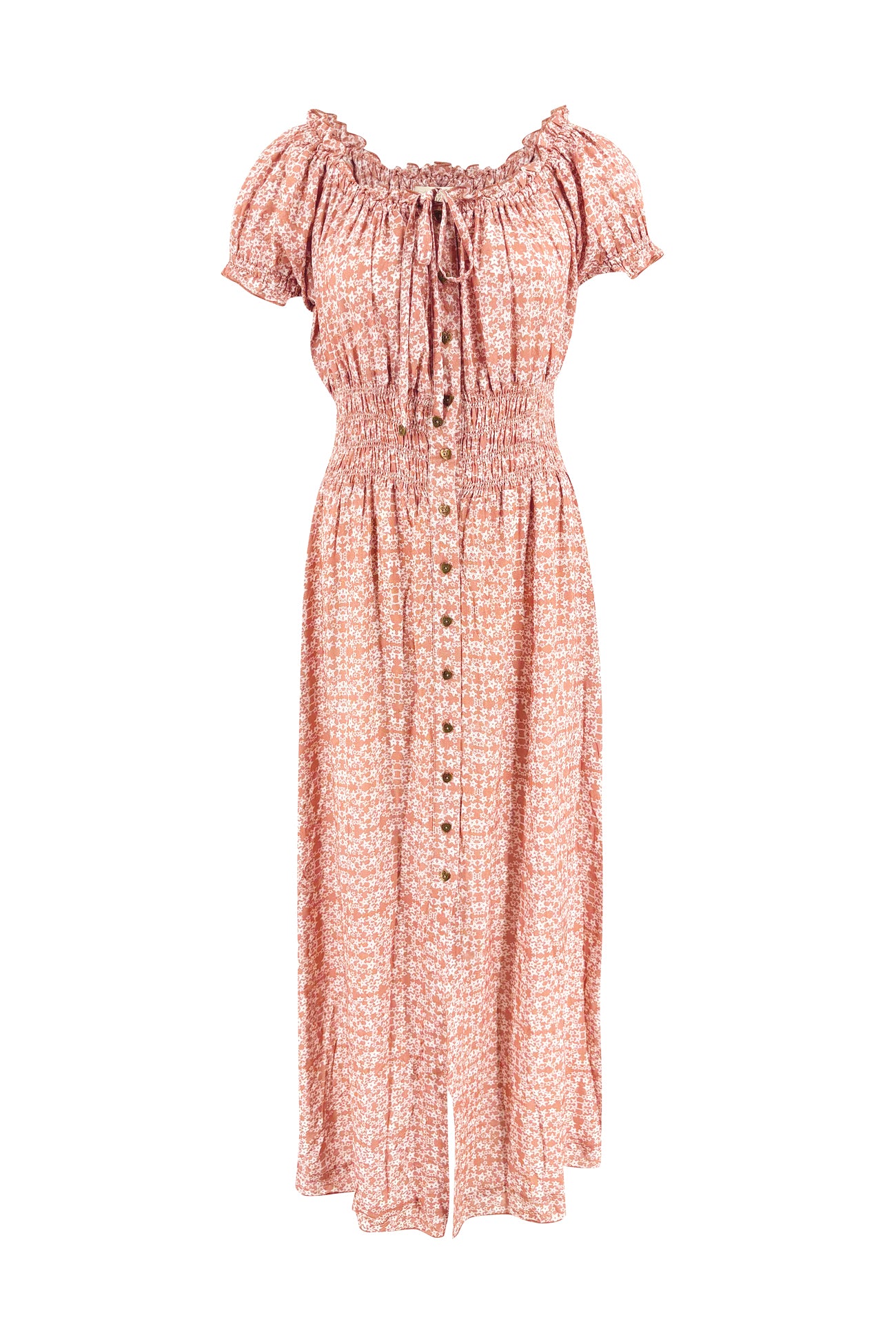 The light fabric feels comfortable on the skin and makes this long summer dress ideal for warm temperatures. The full-length button closure gives the design extra character and creates a subtle lengthening effect. The soft print enhances the romantic look without being overpowering.